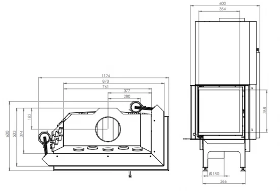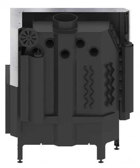 – Kaminkörper (zusätzlich verstärkt mit Rippen) und Kaminfront aus massivem Kesselstahl