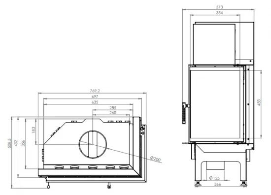 – Kaminkörper (zusätzlich verstärkt mit Rippen) und Kaminfront aus massivem Kesselstahl