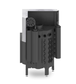 Der eingebaute Deflektor verlängert den Rauchgasweg und ermöglicht die Nachverbrennung der Rauchgase. Die Verbrennungsluft, welche über den externen Verbrennungsluftstutzen bezogen wird, wird sehr aufwendig in der Brennzelle verteilt. So entsteht ein Luftstrom für die Primärluft, ein weite