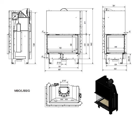 Eck-Kamineinsatz Kratki MBO/L/BS/G 15 Schiebetür und Seitenscheibe links