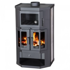Im geräumigen Holzfach können Scheite gelagert und nachgetrocknet werden. Mittels eines in den Kaminofen integrierten Backfaches ist es möglich, unabhängig von Strom oder Gas zu Kochen oder zu Backen. Im Backfach können Sie Pizza oder Brot bzw. Brötchen aufbacken. In kürzester Zeit werden Pizzas perfekt knusprig wie im italienischen Restaurant. Backfachtemperaturen von 280°C sind ohne Probleme möglich! Auch ist das Backfach schön gleichmäßig heiß. (Sie finden unser Testvideo auf Youtube.) Wir haben schon einige Modelle mit Backfunktion ausprobiert. Der Taro hat aber mit Abstand eines der besten Backfunktionen. Neben dem Backfach wurde dieser hochwertige Kamin mit einer vollwertigen Herdplatte ausgerüstet. Auf dieser können Sie sich eine Suppe oder einen Tee kochen oder ein Spiegelei braten. So haben Sie ohne Strom oder Gas die Möglichkeit zu kochen und zu backen! Außerdem nutzen Sie die Wärme des Ofens sehr effizient. Wenn der Ofen sowieso brennt, warum dann nicht gleich noch heißes Wasser erzeugen?