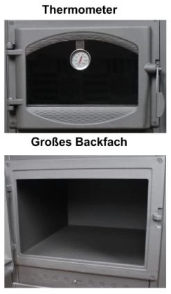 Kochen und Heizen gleichzeitig – dieses Problem wird in eleganter, praktischer und rationeller Form gelöst: Mittels eines in den Kaminofen integrierten Backfaches ist es möglich, unabhängig von Strom oder Gas zu Kochen oder zu Backen. Im Backfach können Sie Pizza oder Brot bzw. Brötchen aufbacken. So haben Sie ohne Strom oder Gas die Möglichkeit zu kochen und zu backen.