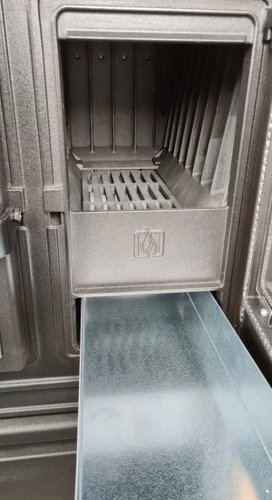Der geräumige Brennraum ist aus Gusseisen. Dieser Premiumherd kommt ohne Schamotte oder Vermiculiteauskleidung aus. Auch die Herdplatten, Rahmen, Türen sowie die komplette Front ist aus massiven Gusseisen gebaut. Diese robuste Bauweise sorgt für Langlebigkeit und damit ungetrübter Freude am Flammenspiel und schont den Geldbeutel in Bezug auf die Ersatzteilkosten. So eine erstklassige Konstruktion ist in dem Preissegment selten zu finden. Zum Ausstattungsumfang gehört ebenso ein praktisches Aschefach zur einfachen Entleerung der Brennrückstände. Sein Aschekasten ist überdurchschnittlich groß.
