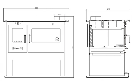Das Backfach und der 150mm Rauchrohranschluss befinden sich oben rechts. (Aktuell wird leider keine linke Ausführung gebaut.)