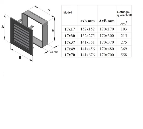 Die Abmessung bzw. Einbaumaße sowie den freien Luftdurchlassquerschnitt entnehmen Sie bitte der Detailzeichnung.