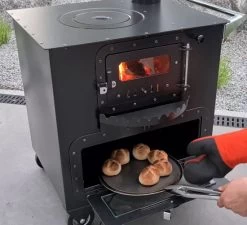 Kochen und Heizen gleichzeitig – dieses Problem wird in eleganter, praktischer und rationeller Form gelöst: Mittels eines geräumigen, emaillierten Backfaches sowie der großen Kochfläche ist es möglich, unabhängig von Strom oder Gas vollwertig zu Kochen oder zu Backen. Das Backfach befindet sich unter dem Brennraum. So wurde ein sehr kompakter Gartenherd geschaffen. Durch das Betätigen der Anheizklappe (Hebel oben rechts) werden die Rauchgase um das Backfach gelenkt. Die Backröhre wird dadurch gleichmäßig heiß! Das ist ein großer Vorteil von „Elise“: Brot, Pizza oder Aufläufe müssen somit nicht so oft im Backfach gedreht werden. Ein Einschub für einen optionalen Backofenrost ist ebenfalls vorhanden. So haben Sie die Möglichkeit, z.B. zwei Familienpizzas gleichzeitig zu backen.