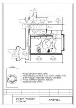 Der Ofen DORY Box dient nicht nur zum lokalen Beheizen, sondern in erster Linie zum Beheizen von weiter entfernten Räumlichkeiten oder Räumen im gesamten Gebäude mit Hilfe von Warmluftleitungen und Ventilatoren. Der Ofen kann außerhalb des beheizten Raumes aufgestellt werden, zum Beispiel (Kesselraum, Technikraum u.Ä.) Der Ventilator bringt die Luft zum hinteren unteren Bereich des Ofens. Die Luft strömt rund um den Ofen, und über den Wärmetauscher wird sie zu zwei Flanschen im hinteren Bereich des Ofens geleitet. Dadurch wird die Wärme effizient weiter gegeben und eine hohe Wirksamkeit erreicht. Die erwärmte Luft kann über Warmluftleitungen verteilt werden. Dieser Kreis kann geschlossen und mit einem Filter ergänzt werden. Der Ofen ist mit einer elektronischen Steuerung der Drehzahl des LTR Ventilators ausgestattet, die abhängig von der Temperatur für einen idealen Durchfluss der erhitzten Luft sorgt.